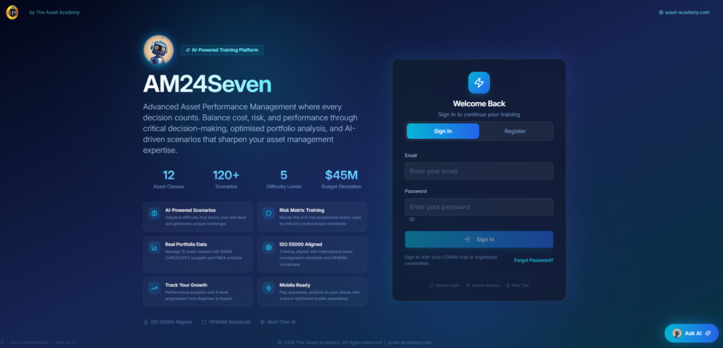 Not another framework.Not another standard.Not another ISO checklist. Because we already have those. And yet… Asset Management still doesn’t stick. Why? Because people do Asset Management — and people don’t learn through documents.They learn through decisions, pressure, and consequences. That’s why we built AM24Seven. A serious Asset Management simulation where you step into a live…